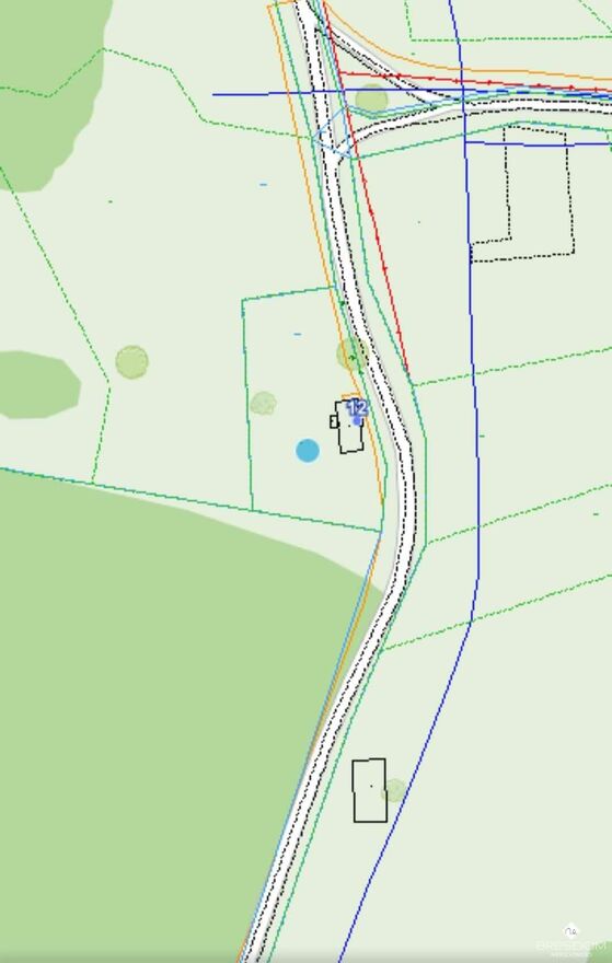- linia zabudowy - w odległości 20m zewnętrznej krawędzi jezdni drogi powiatowej oraz w odległości 12m od granicy lasu,